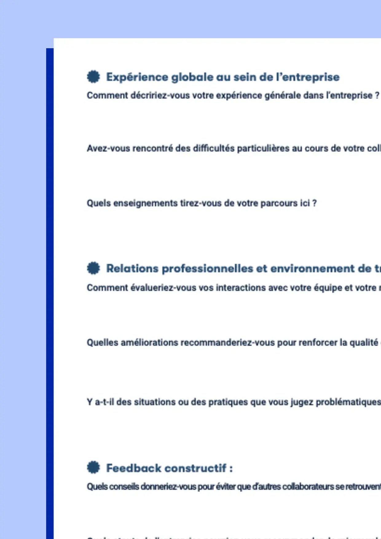 Démission, rupture conventionnelle, licenciement, etc. : retrouvez les trames d'entretien prêtes à l'emploi pour accompagner les talents lors de la période précédant leur départ effectif de l'organisation.